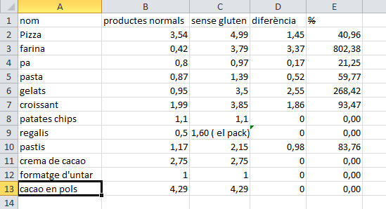 La taula que hi ha a continució conté uns resultats d'una comparativa dels preus. Com podreu apreciar es nota que els productes per a celíacs tenen un preu més elevat que els normals. Encara que no ens donem compte alguns productes que consumim normalment no tenen gluten com per exemple les galetes de dinosaures o altres exemples.